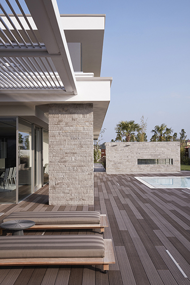 Quel che spicca sono la sovrapposizione di piani e l’attenzione alle esposizioni che porta a avere a nord una zona raccolta e riservata, mentre a sud si sviluppa un’area aperta e libera. Proprio in questa zona si trovano infatti gli spazi esterni e la piscina pensati e arredati però per essere in armonica connessione con il living. “
